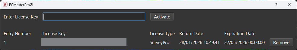 The license for SurveyorPro is activated in the same way as for SLAM and Strip Align, but the only difference is that the license type will be “SurveyPro” as shown below.