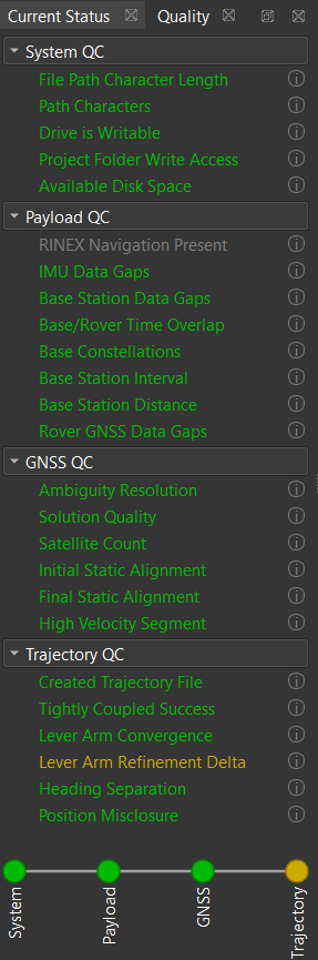 - Current Status: This button toggles the Status bar to show or hide. Also toggles Quality tab metrics used in post processing to show GNSS, INS, and Trajectory quality along with local system quality checks. Information and found values can be seen by clicking the info icon.