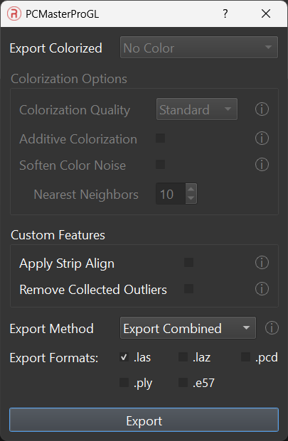 - Export Colorized: Choose between uncolorized and colorized point clouds.