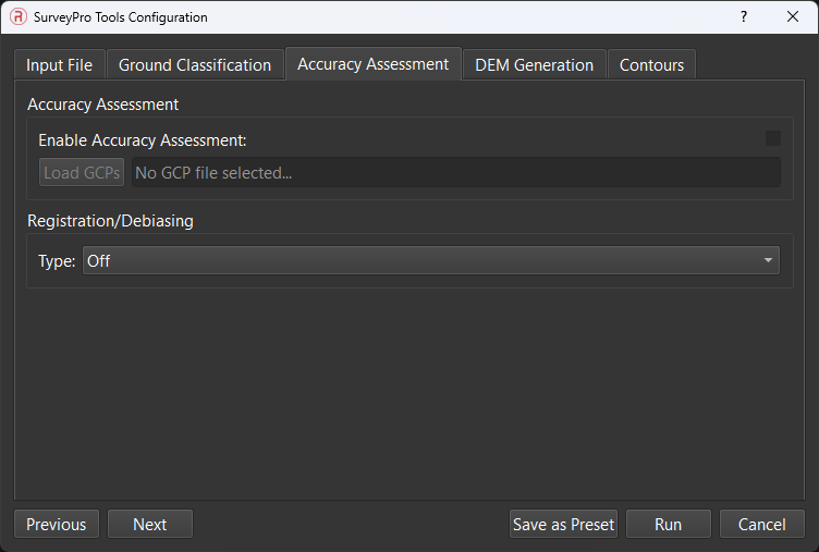 Field entries can be configured to how the user would like. Each tab of the dialogue shows a different step of the SurveyPro pipeline. If only wishing to run a certain step, the user can decide to only check this box and skip other features. After configuring the window to the users processing liking, the Run button may be pressed to processed the selected cloud file.