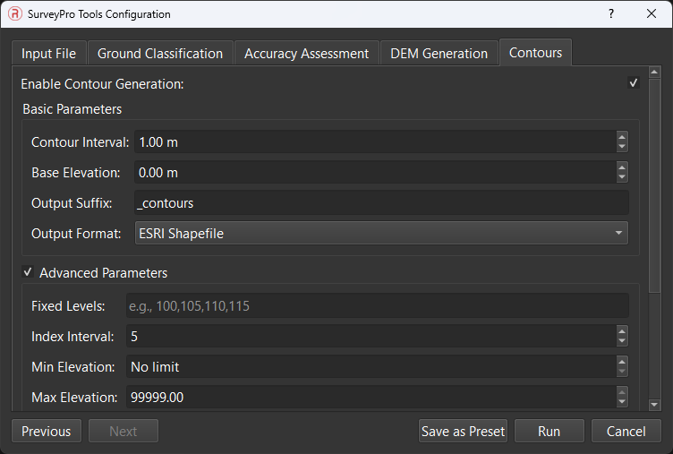 - Fixed Levels: The start of the advanced settings. Designates a specific list of elevation values to extract as contours, independent of the standard interval generation.