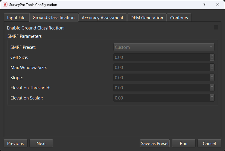 - Ground Classifications Options – checkbox to enable/disable SMRF ground classification. When enabled, points are classified as ground (Classification = 2) or non-ground (Classification = 1) using the Simple Morphological Filter algorithm, which iteratively applies morphological opening operations on an elevation grid to detect bare earth.