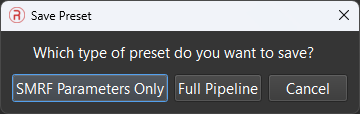 - Save as Preset – Prompts the user to save the currently filled settings as either SMRF only (only ground classification settings) or Pipeline (full workflow). Prompt is followed by a name input. If the user desires to delete a saved preset, find the file named “surveyToolsPresets” within the install directory, open in notepad, and delete the line containing the cooresponding preset name. This file must be saved and PCMasterPro must be restarted for changes to take effect.