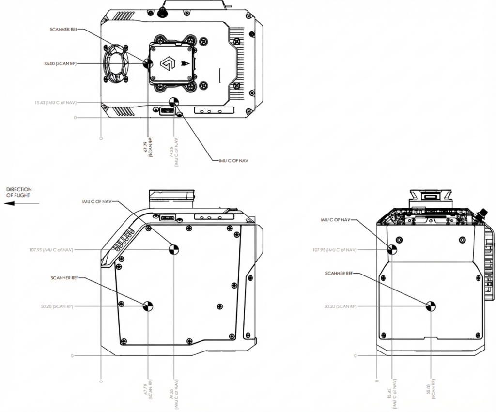 - Input the antenna’s location relative to the internal IMU using the provided orientation references, as shown below. Measure the distance from the IMU to the antenna’s center, adjusting for any antenna positioning that is left, behind, or below the unit. Accurate values are crucial for missions as they influence real-time processing in RTK and recording for PPK. For the best data quality, ensure precision in these measurements.