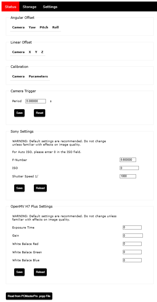 • View and modify angular and linear offsets, and calibration parameters. To load new parameters, select “Read from PCMasterPro .pcpp File”.