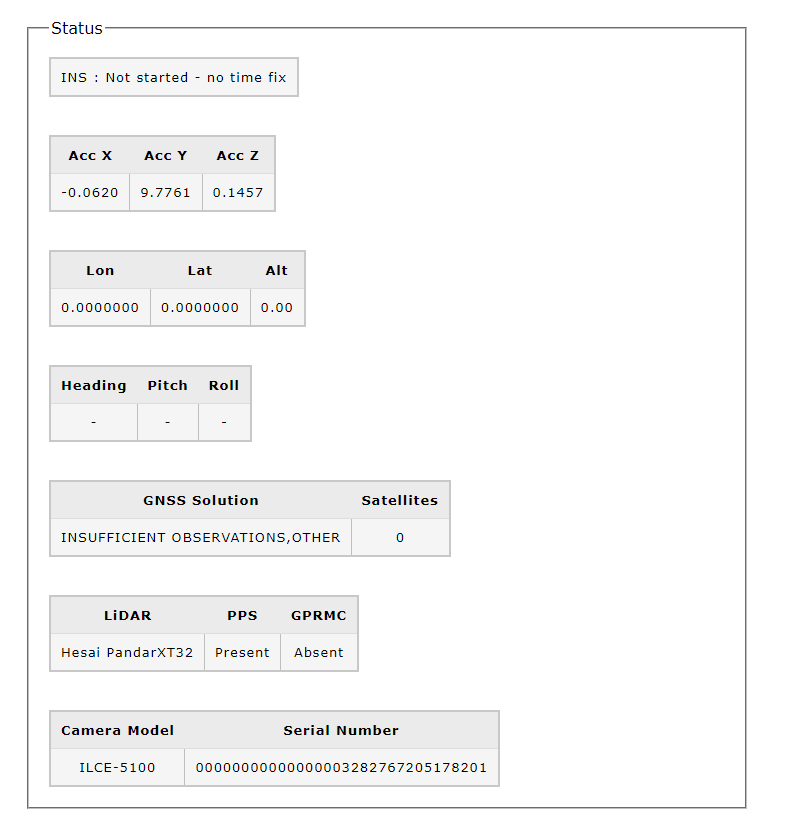 The “Status” option provides real-time information about the payload. It displays data on accelerations, position, attitude, GNSS status, LiDAR status, and camera status, as shown below. If RTK with RTCM Corrections is being used, information about the base station’s location will appear here. For dual antenna setups, the status of both the primary and secondary antennas will be displayed.