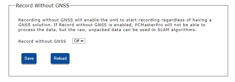 Users can begin recording data without sufficient or any satellite coverage by setting this option to “On”, as shown below. In this case, data recording will be performed for SLAM. Click “Save” to apply the selection or “Reload” to refresh the current selection.