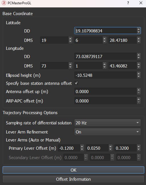 Confirm or modify the IMU to Antenna lever arm offsets when prompted. If saved to the web GUI prior to the flight, these values will be shown. PCMasterProGL will still calculate and refine its measurements whether offsets have been entered or not. Preset offsets can reduce processing time by providing an initial value.