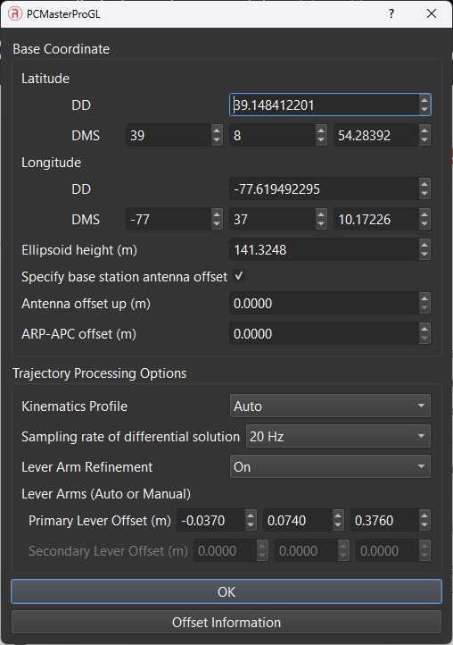 8. Confirm or modify the IMU to Antenna lever arm offsets when prompted. If saved to the web GUI prior to the flight, these values will be shown. PCMasterProGL will still calculate and refine its measurements whether offsets have been entered or not. Preset offsets can reduce processing time by providing an initial value.