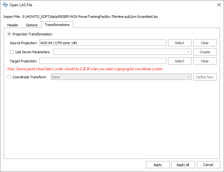 - We’ll leave all of these options at their defaults. To load the point cloud, click on “Apply”.