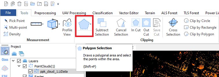 The next step is to prepare the point cloud for georeferencing. To do this, we will use the crop tool to remove unnecessary points and also thin out the cloud. This will also speed up data processing.