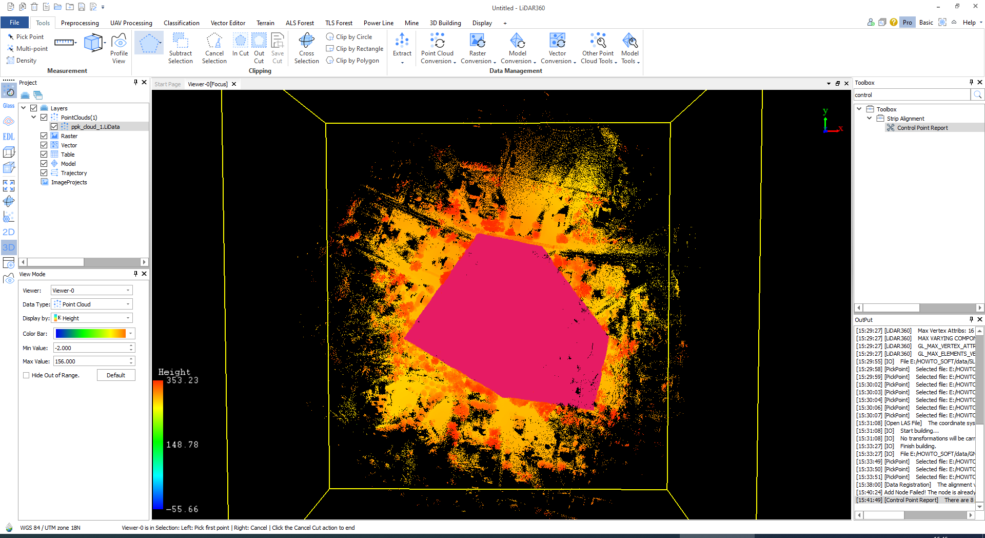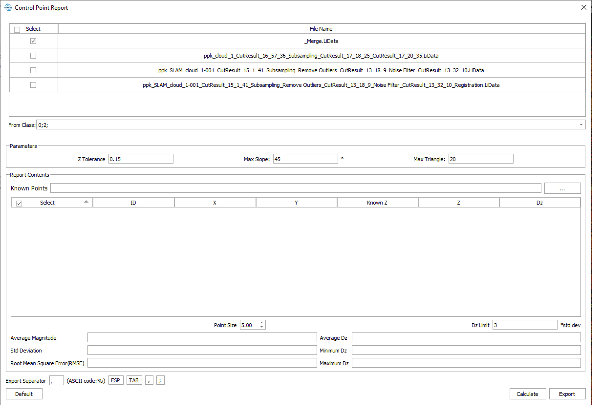 The control point report tool will create a report about the elevation difference between laser point clouds and ground control points, which can be used to check the elevation accuracy of laser point clouds and improve the height accuracy of laser point clouds using calculated adjusted values.