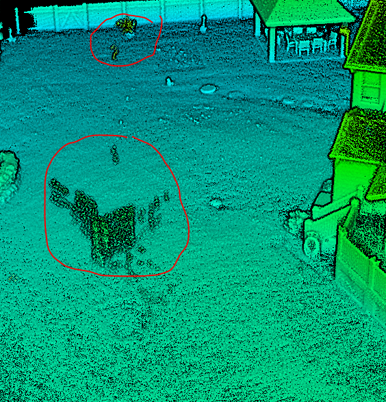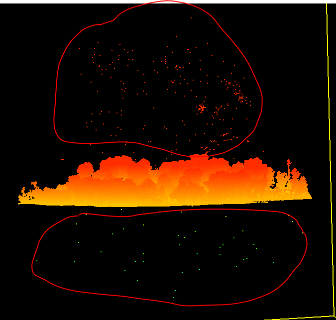 The SLAM point cloud is processed similarly, but due to the nature of SLAM algorithms, additional filtering may be required. Moving objects can leave trails in the point cloud. This can be the flight of birds, the movement of people, etc., as shown in Figure 11.