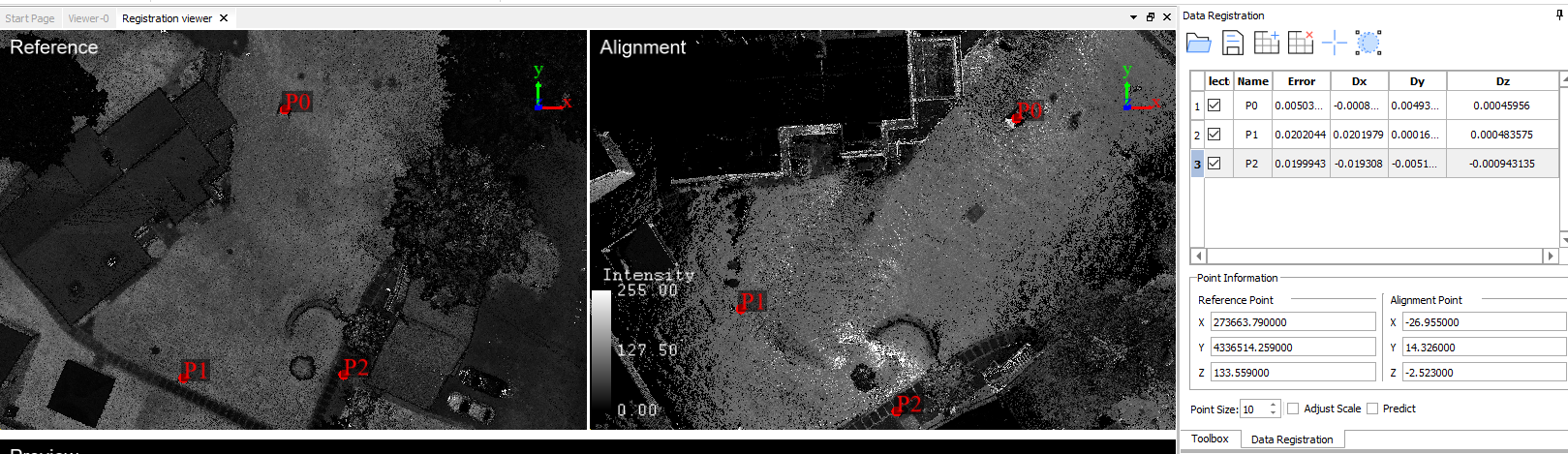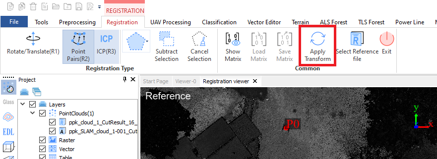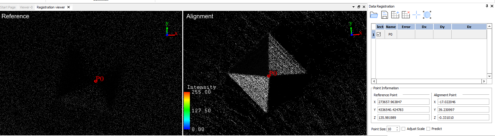 - We found a special marker in both clouds, and now we need to add a point. To do this, click “Add Point” in the “Data Registration” panel. The point “P0” will be added to the list of points. Then click “Pick Points” to activate the point selection tool (icon will change the background color to indicate that the tool is active). Click in the reference and SLAM clouds in the same place on the special marker. As a result, the point “P0” will appear in the point clouds, as shown in Figure 24. In order not to accidentally change the point, click on the “Pick Points” to cancel the selection of the tool for adding a point to the cloud.