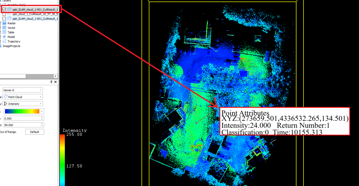 - Our georeferenced SLAM cloud will be displayed in the list of layers. To check, we will use the already familiar “Pick Point” tool, Figure 31.