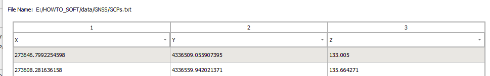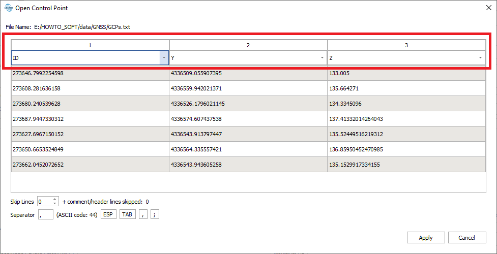 - If necessary, you can change the type of column according to the data. By default, the first column is assigned as the point number. In our case, it is not in the text file, so we replace the first column in the drop-down list with “X”, the second and third will be the coordinates “Y” and “Z”, respectively, Figure 39.