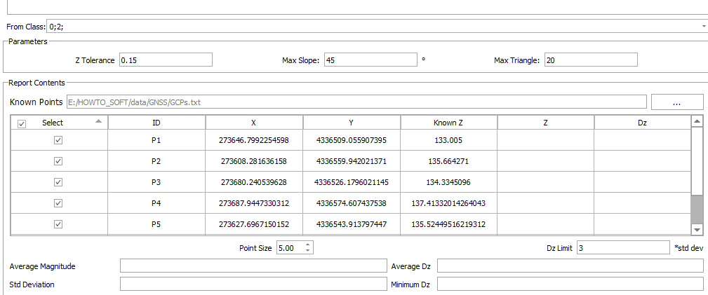 - Dz limit (default value is “3”): Set the tolerance of Dz. If Dz is not within the tolerance, show red in order to inspect the elevation difference with a large error between the point cloud and control points. Maximum tolerance = Average Dz + Dz * Std Deviation. Minimum tolerance = Average Dz – Dz * Std Deviation