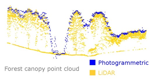 Photogrammetric methods for creating digital elevation models from overlapping aerial or satellite images can accurately cover large areas. They are like LiDAR, but these methods do not provide information about the surface under tree canopies and other possible obstacles, as shown in Figure 2 [15].
