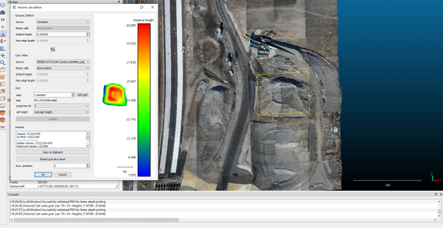 Look at a real example of using RESEPI in constructing a road junction. Data was collected by flying over the construction site and then processed in PCMasterPro. The flight with processing took no more than an hour, after which the point cloud opened in Cloud Compare to calculate the spoil volume [8], Figure 4. As seen in the “Result” field, volume = 73.5 m3.