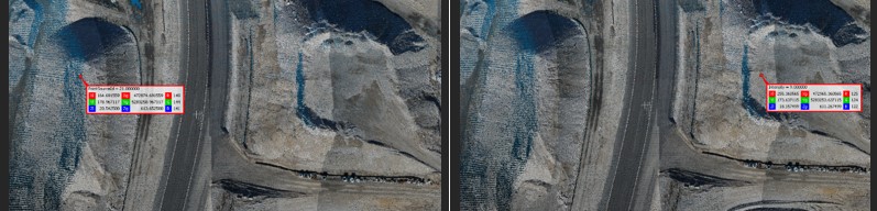 Since the point cloud contains information about the coordinates of each point, the user can calculate the volume and height. Look at Figure 5, where two embankments are of different heights. As can be noticed, the parameter Zg is responsible for the height of the point; in the first case, it is equal to 613.6 m, and in the second case, it is 611.2 m. After spending just an hour flying and processing, the user can conclude that one of the spoils should be increased so that the heights are equal and more workers are sent to the desired point on the construction site.